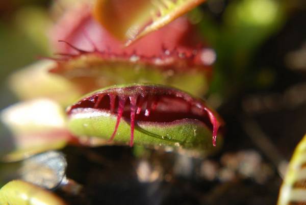 Летом «челюсти» венериной мухоловки ярко-красные, чтобы привлекать насекомых, выделяют сладкий нектар. Внутри них находятся чувствительные волоски и железы, выделяющие пищеварительный сок.